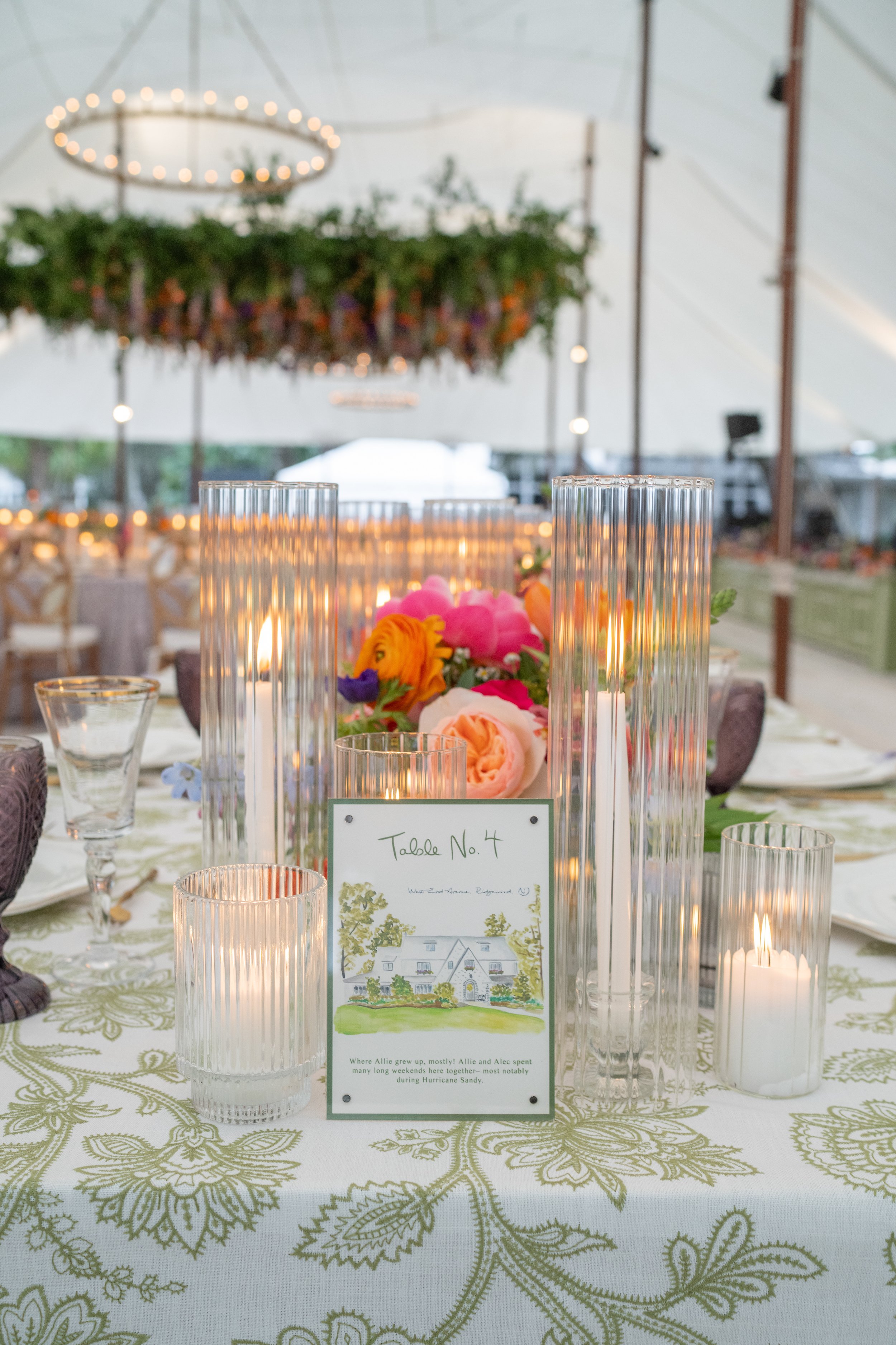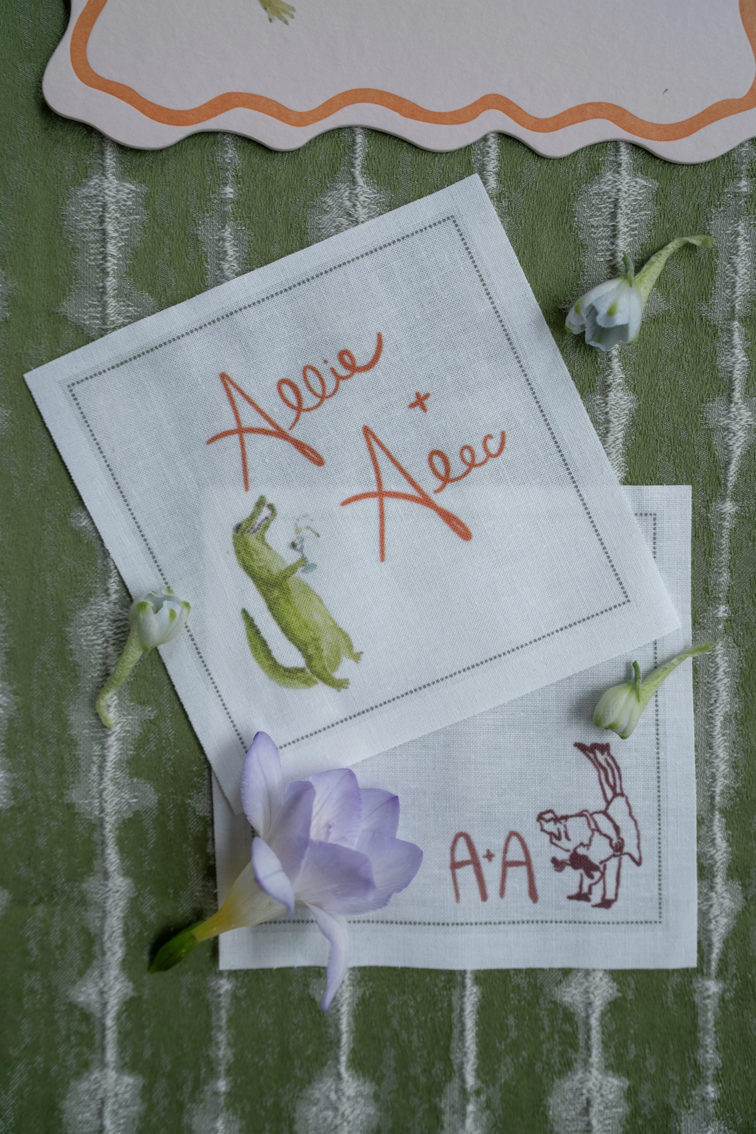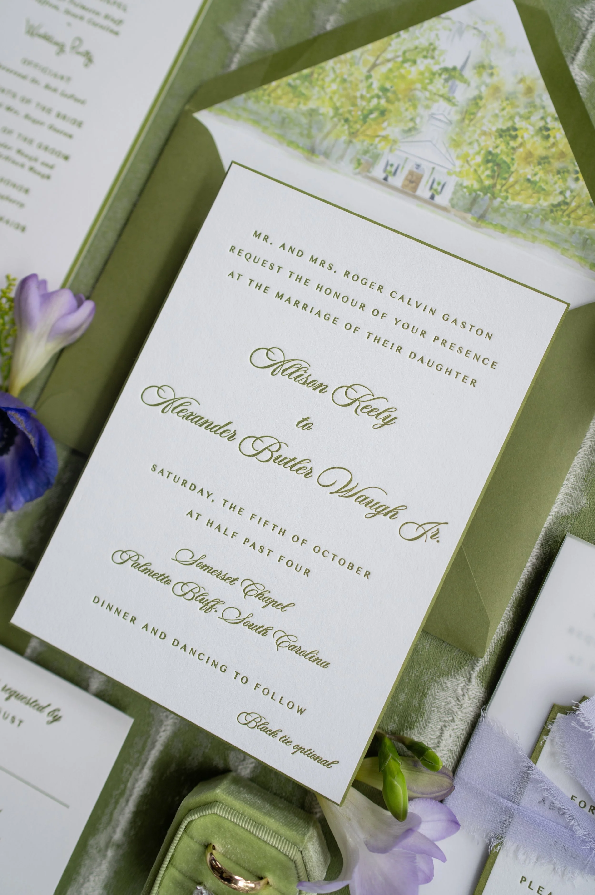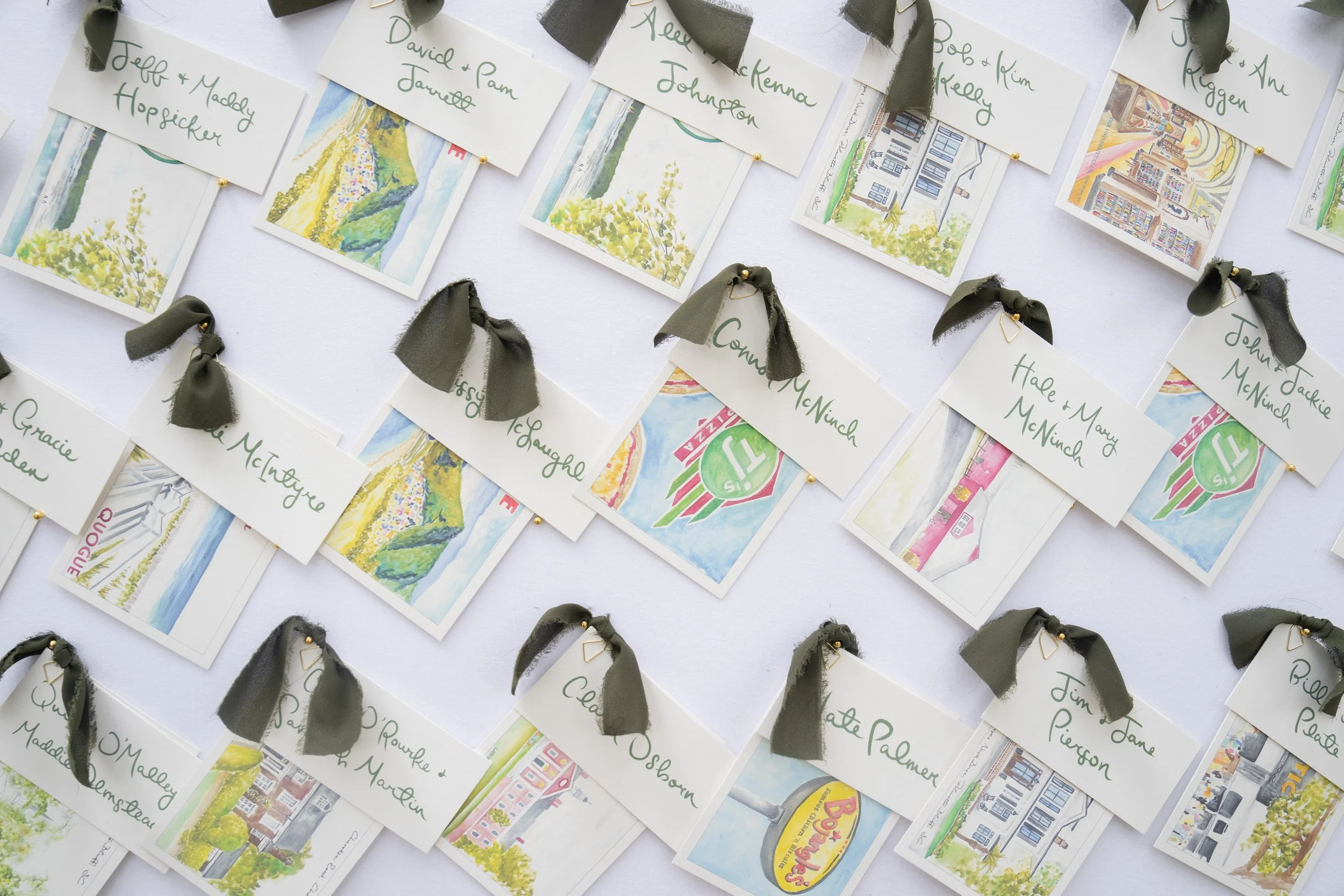 Allie and Alec wanted their stationery to feel deeply personal and rooted in their story. Watercolor illustrations highlighted meaningful places - from childhood homes to cities they’ve shared together. Each guest received a custom postcard featuring one of these places, matched to their table number, creating a thoughtful bridge between the invitation and the celebration. A mix of handwritten details and formal script struck the perfect balance of playfulness and elegance, while a moss green palette tied everything together - from the mailed invitations to the wedding-day pieces. For the after party, they even branded their own speakeasy, a nod to their favorite NYC spot, carrying their vision through every detail.