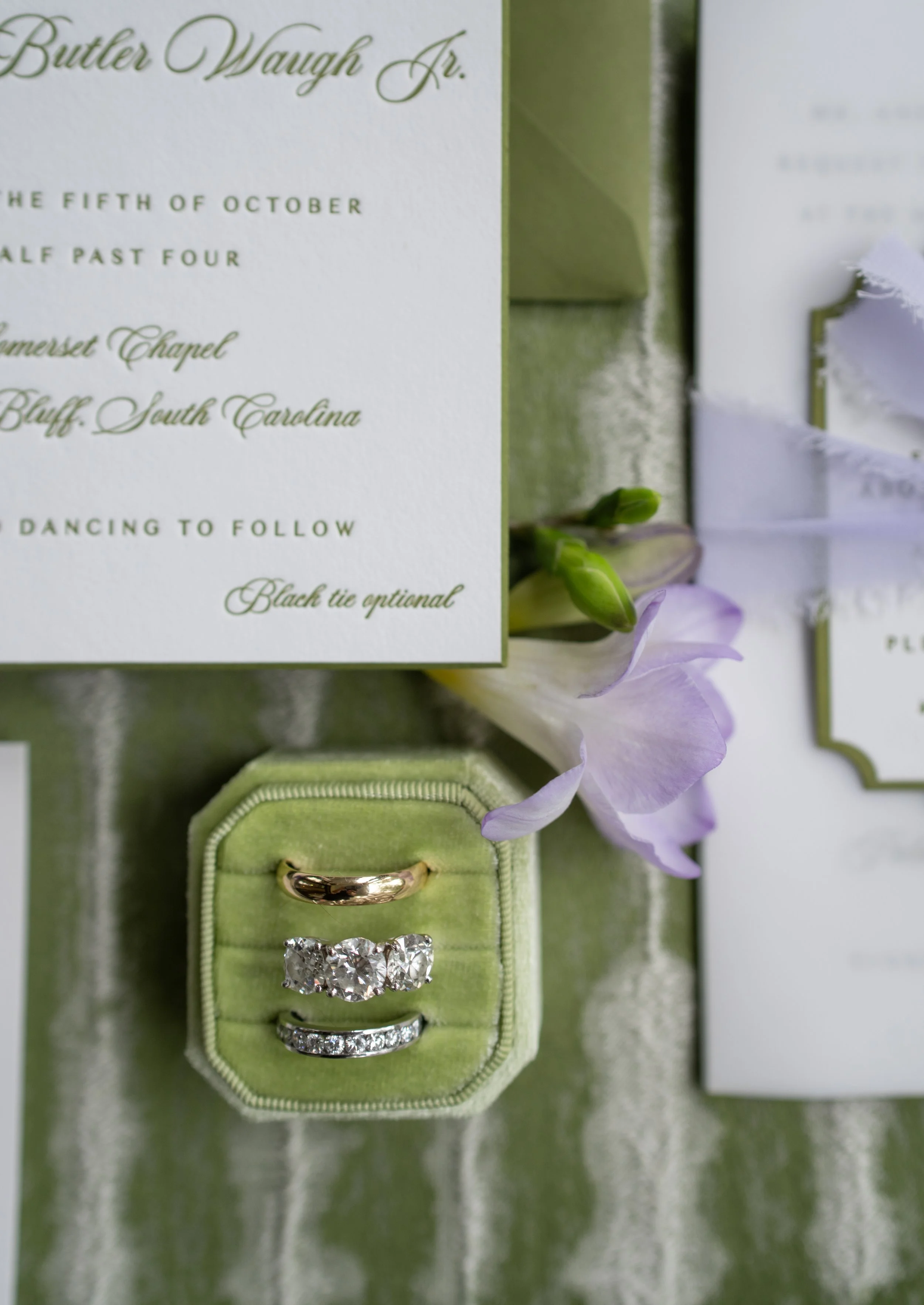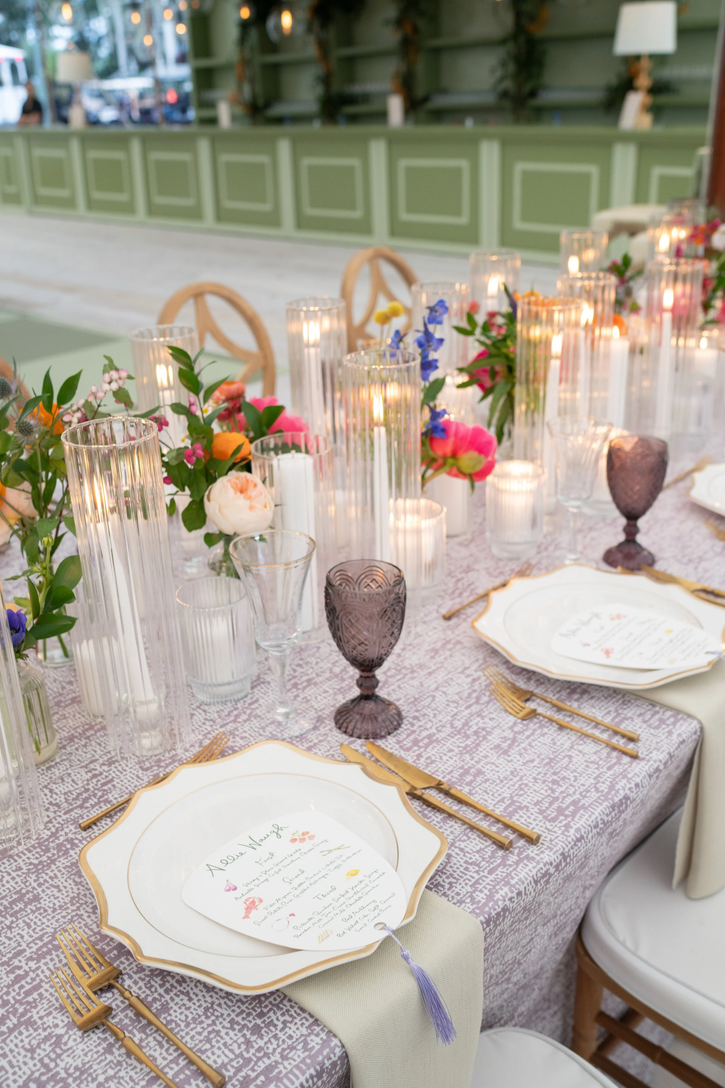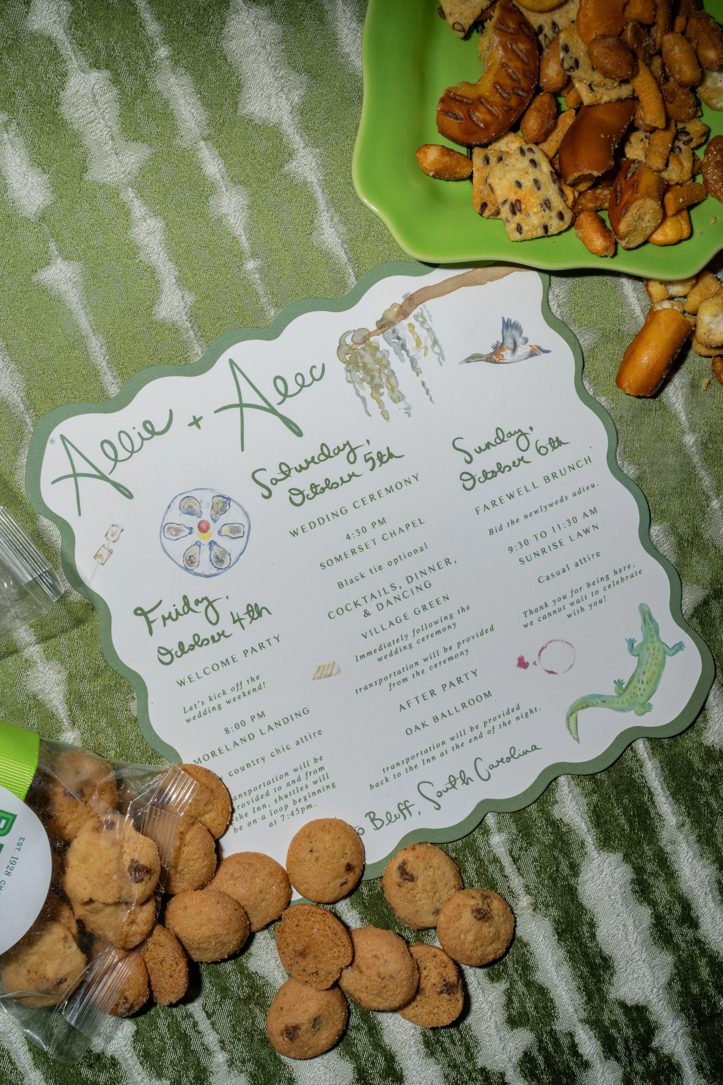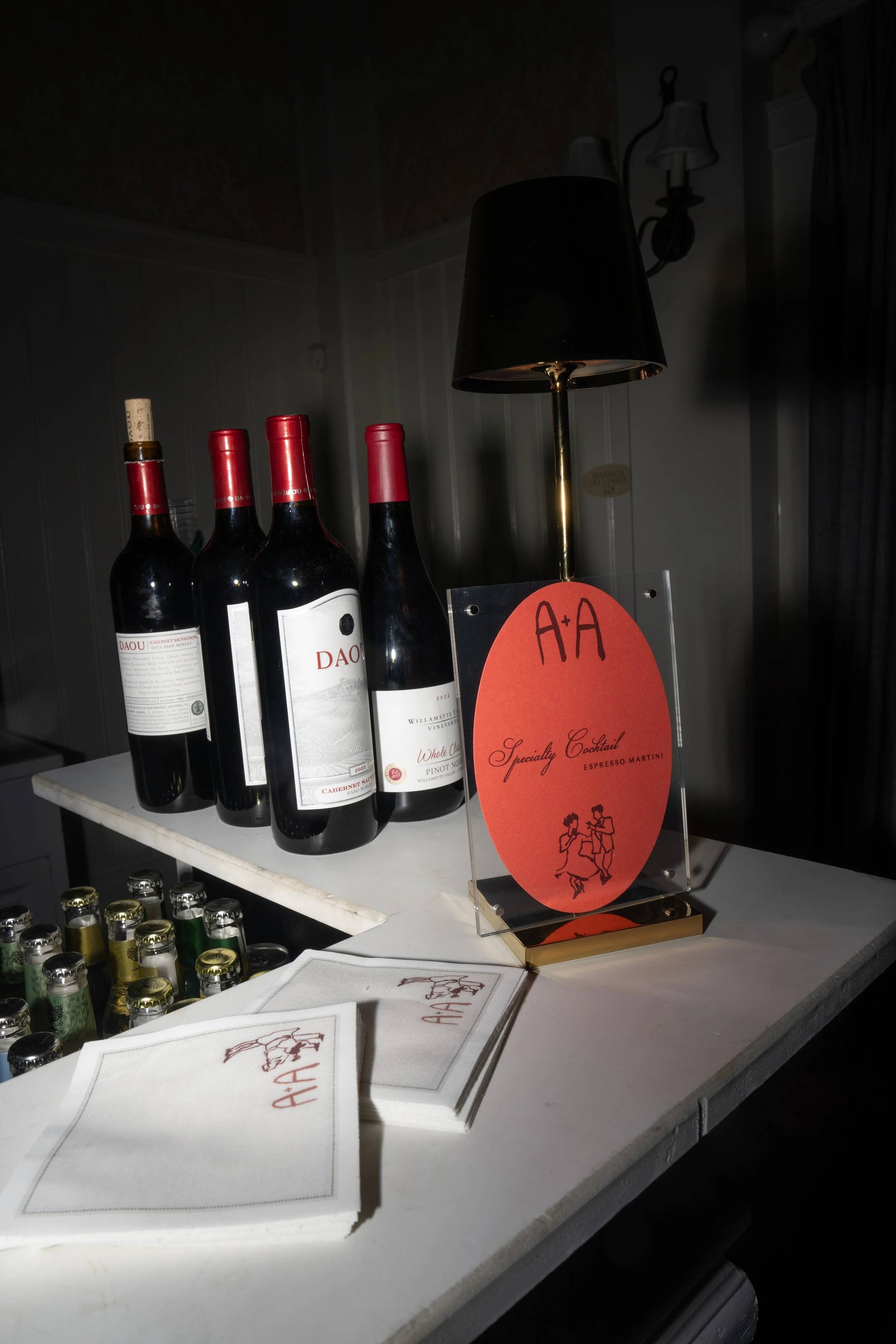 Allie and Alec wanted their stationery to feel deeply personal and rooted in their story. Watercolor illustrations highlighted meaningful places - from childhood homes to cities they’ve shared together. Each guest received a custom postcard featuring one of these places, matched to their table number, creating a thoughtful bridge between the invitation and the celebration. A mix of handwritten details and formal script struck the perfect balance of playfulness and elegance, while a moss green palette tied everything together - from the mailed invitations to the wedding-day pieces. For the after party, they even branded their own speakeasy, a nod to their favorite NYC spot, carrying their vision through every detail.
