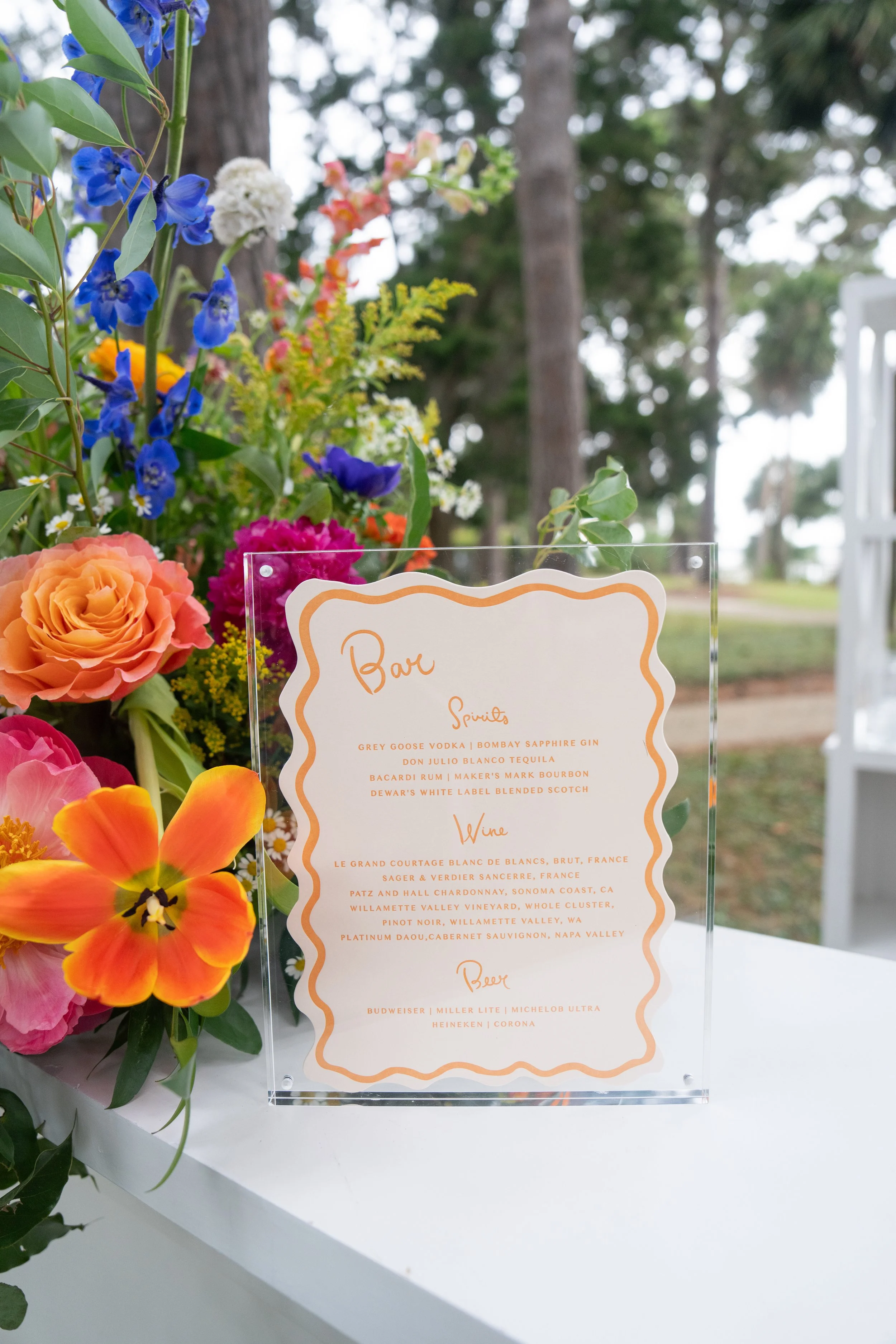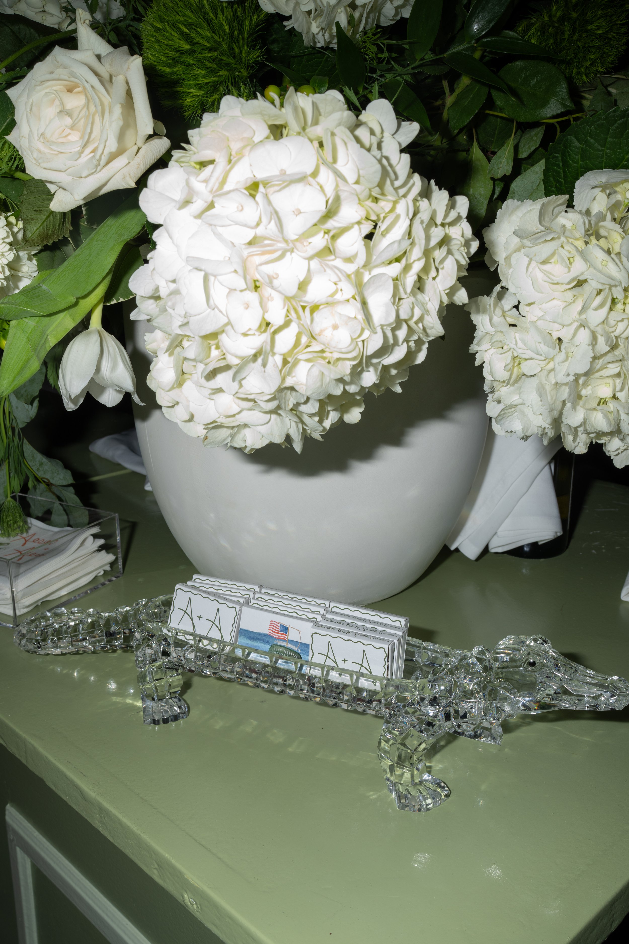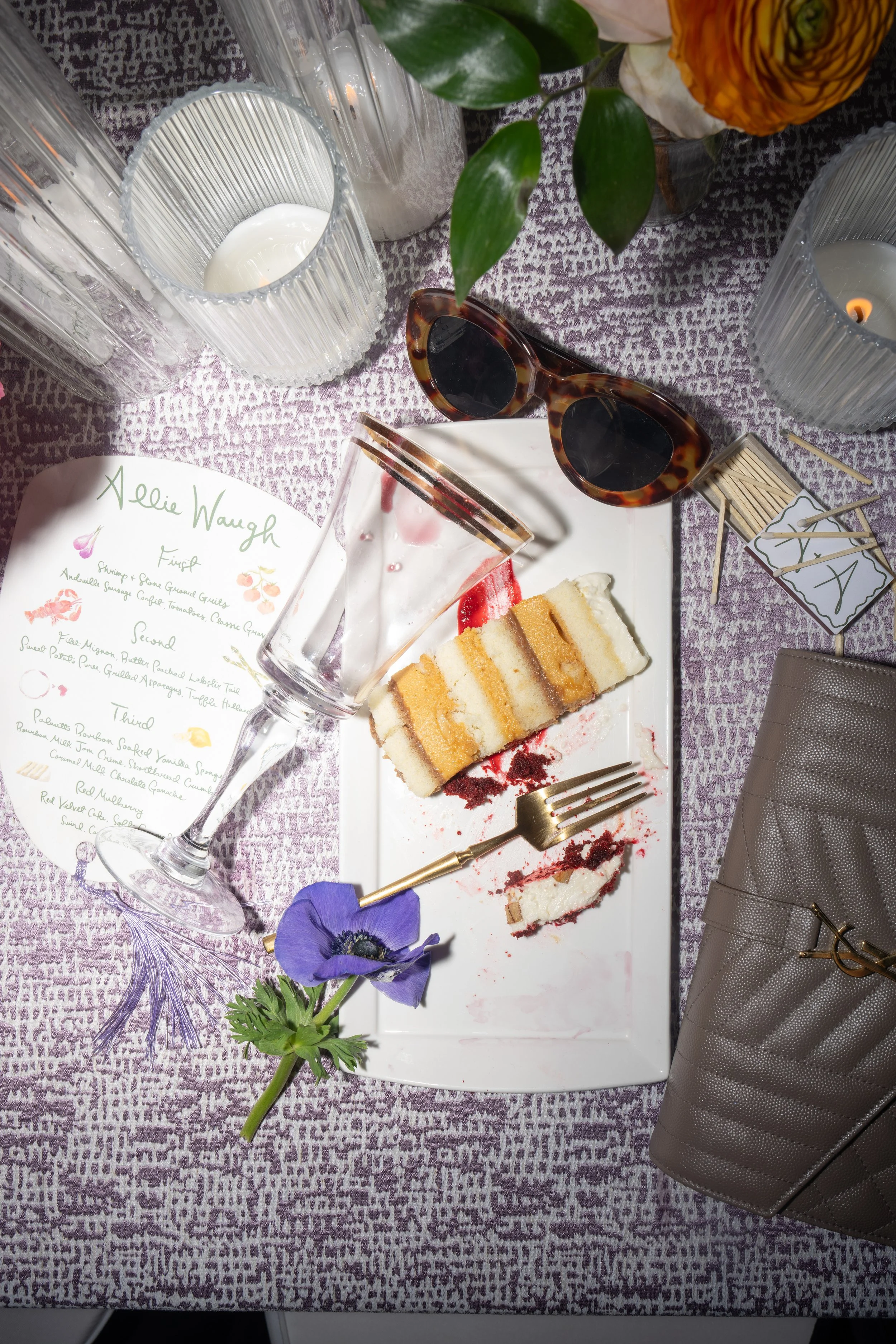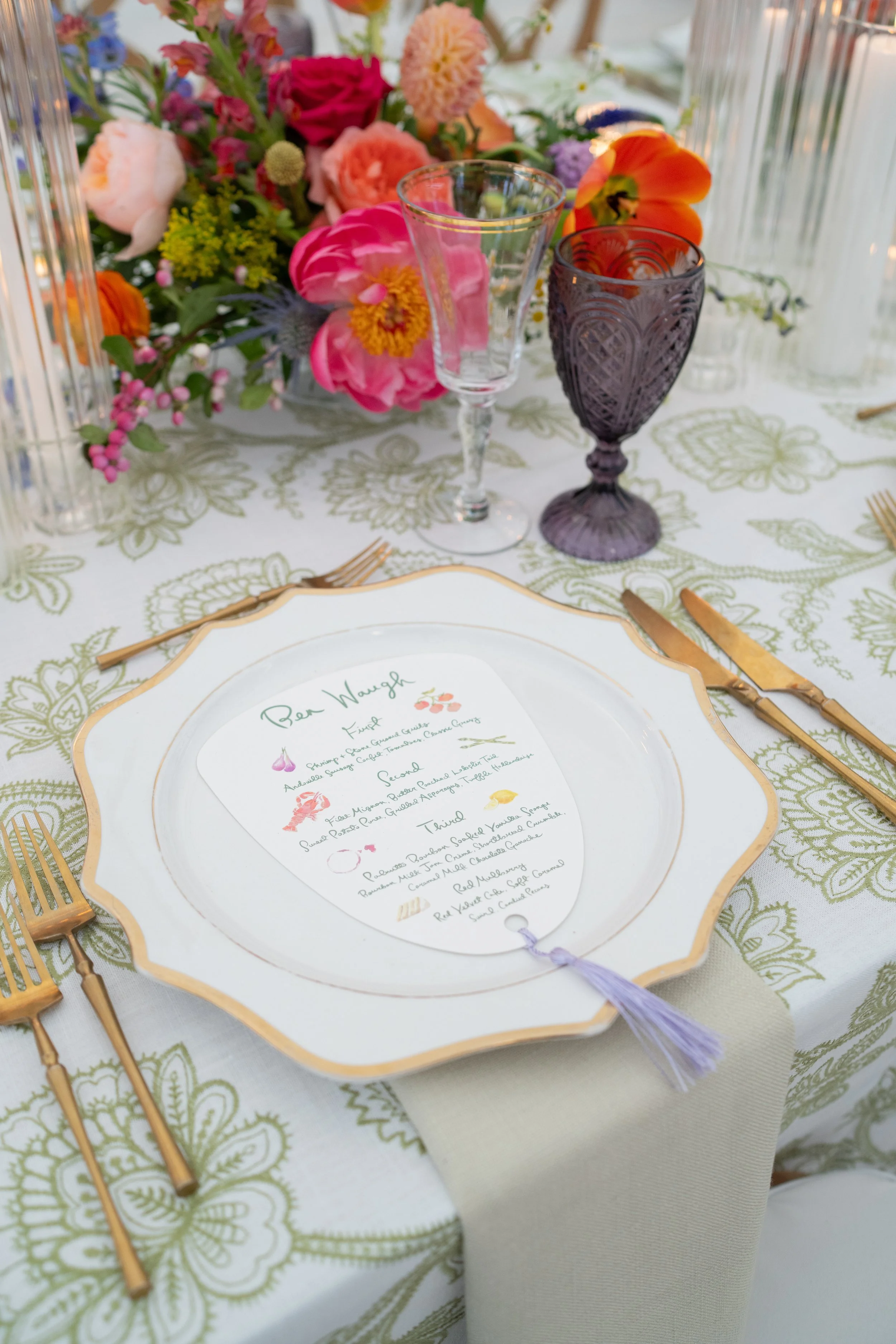 Allie and Alec wanted their stationery to feel deeply personal and rooted in their story. Watercolor illustrations highlighted meaningful places - from childhood homes to cities they’ve shared together. Each guest received a custom postcard featuring one of these places, matched to their table number, creating a thoughtful bridge between the invitation and the celebration. A mix of handwritten details and formal script struck the perfect balance of playfulness and elegance, while a moss green palette tied everything together - from the mailed invitations to the wedding-day pieces. For the after party, they even branded their own speakeasy, a nod to their favorite NYC spot, carrying their vision through every detail.